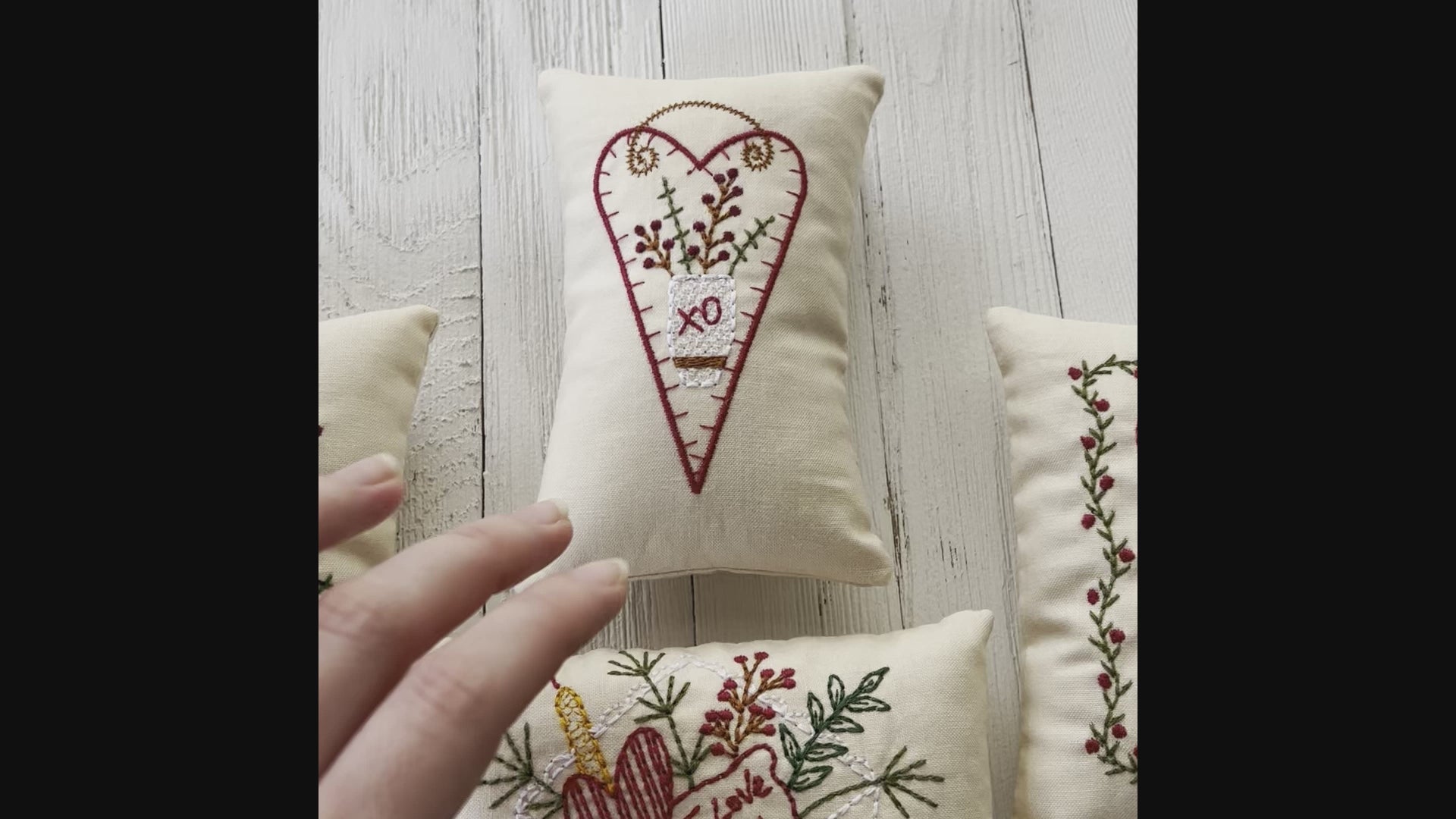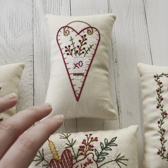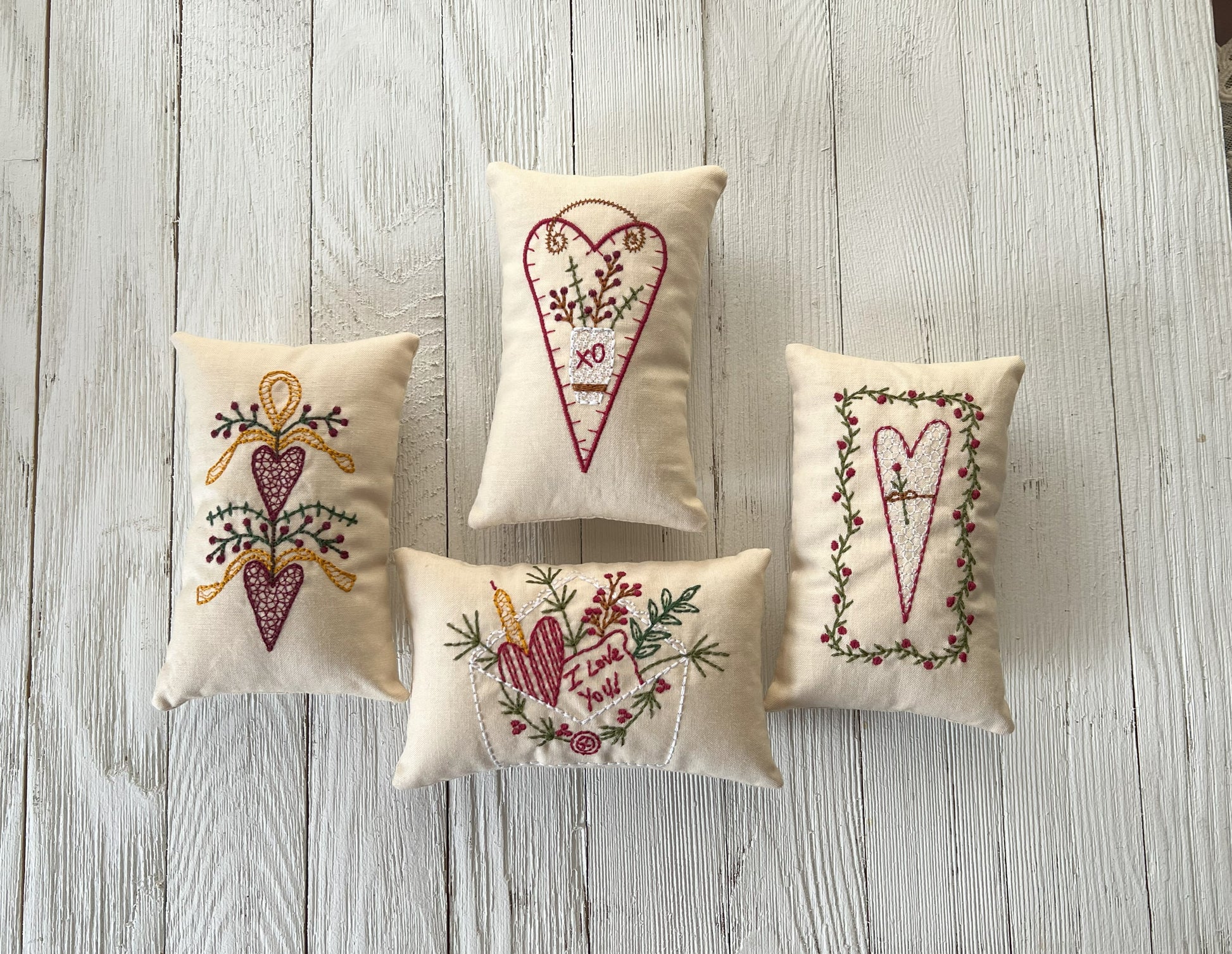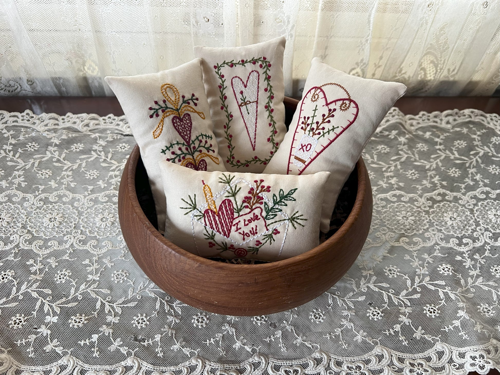 Spruce up your Valentine's Day decor with these charming country-inspired bowl fillers. Embroidered on cream cotton fabric and subtle thread colors, these adorable fillers add a touch of sweetness to your home. Perfect for baskets or tiered trays.